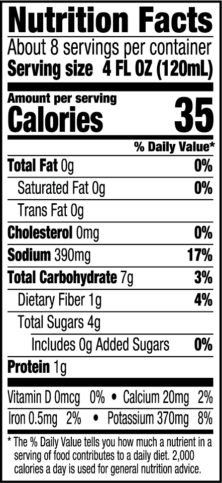 Filtered Water, Organic Tomato Concentrate, Organic Lime Juice, Organic Carrot Juice, Organic Celery Juice, Organic White Vinegar, Sea Salt, Organic Lemon Juice Concentrate, Organic Natural Flavors, Organic Parsley Juice, Organic Beet Juice, Organic Black Pepper, Citric Acid, Organic Chili Pepper Powder, Organic Lettuce Juice, Organic Spinach Juice, Organic Celery Seed Powder.